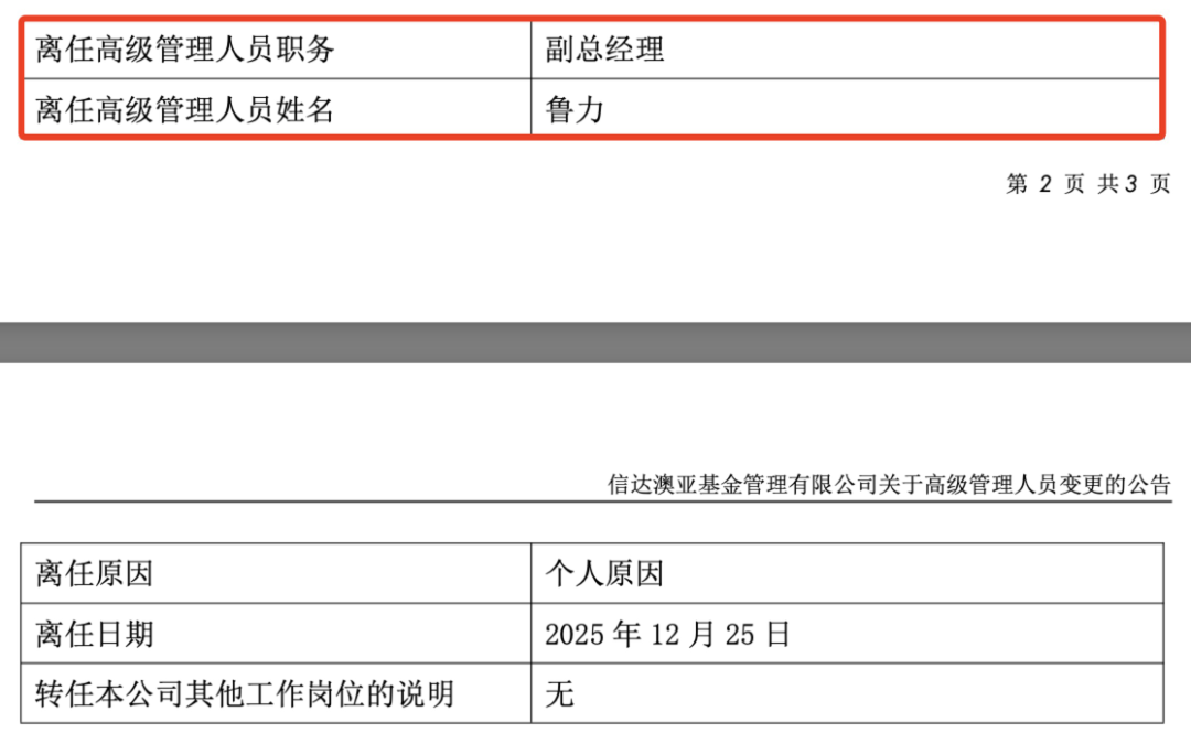 除了董事长变更之外,信达澳亚基金副总经理鲁力也于同一天公告因个人原因离职。