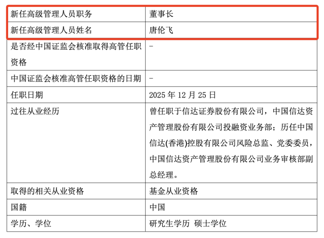 12月26日晚间,信达澳亚基金公告称,原信达资产管理股份有限公司业务审核部副总经理唐伦飞出任公司董事长,同时,副总经理鲁力因个人原因离职。